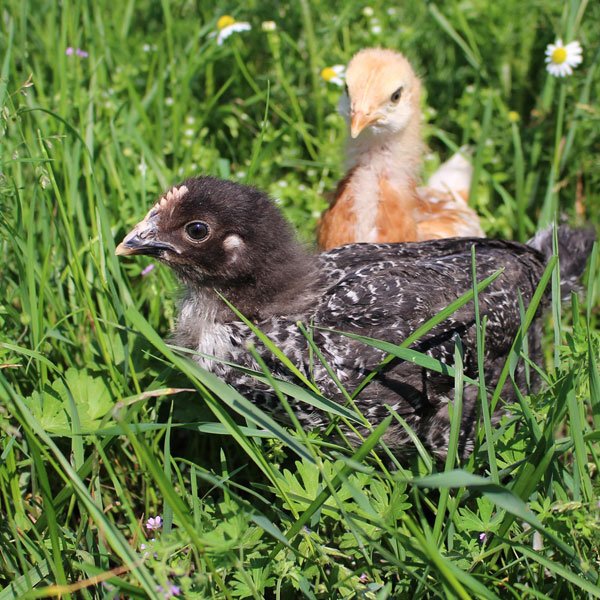 Im März kamen neue Eintagsküken in unterschiedlichen Farben auf den Kudammhof. Sie sind schwarz (coffee) oder schwarz-weiß gemustert (cream). Auch braune Damen waren zu finden. Aus den Elterntieren wie Bresse Gauloise (Henne) x New Hampshire (Hahn) entsteht Coffee – braun, weiß, schwarz gemustertes Gefieder. Aus Bresse Gauloise x White Rock entsteht Cream. Coffee und Cream haben in der Zweinutzung den Schwerpunkt in der Legeleistung. Um die bunte Vielfalt perfekt zu machen, laufen noch reinrassige Bresse Gauloise in der Herde rum, sehr gut an ihren blauen Füßen zu erkennen.