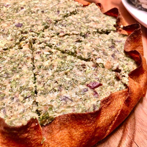 1/2 Endiviensalat (ca. 400 g), 1 Becher (200 g) Vegi Fresh Kräuter (Art.-Nr. 660923), 150 g Maronen (geschält), 3 Eier, 1 Prise Muskatnuss, Salz, Pfeffer, 1/2 Zwiebel, 1 Packung Tortilla Karotte (4 Stck.) (Art.-Nr. 150180), 1 TL Alsan Margarine