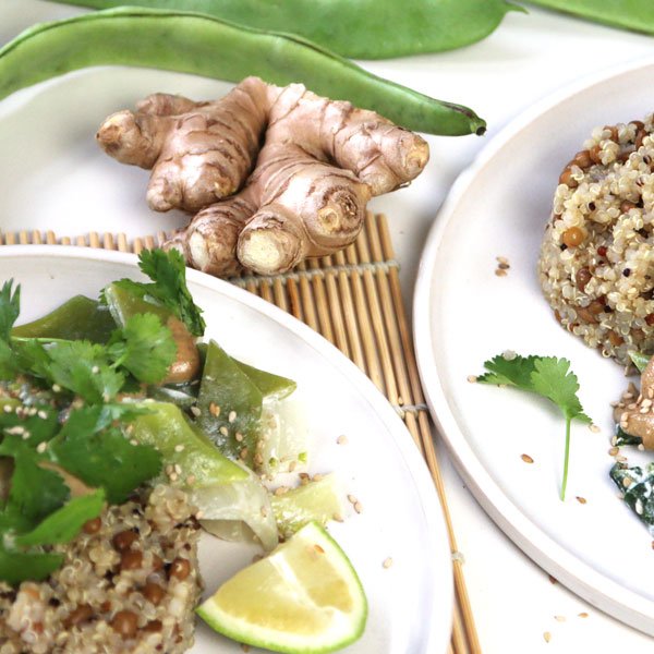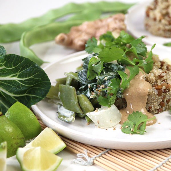 für das Curry: 1 Pak Choi (ca. 300 g), 200 g Buschbohnen, 30 g Ingwerknolle, 1 Knoblauchzehe, 200 ml Kokosmilch, 2 EL Kokosöl, Salz, 2 EL Limettensaft, 1 TL Curry; für den Quinoa: 1 Dose grüne Linsen (Art.-Nr. 702240), 200 g bunten Quinoa, 500 ml Wasser, Salz; für die Sauce: 4 EL Tahin (Art.-Nr. 518605), 3 TL Lemon Balsam (Art.-Nr. 38384), 1 TL Agavendicksaft, 2 TL Sojasauce; frischer Koriander, Sesam