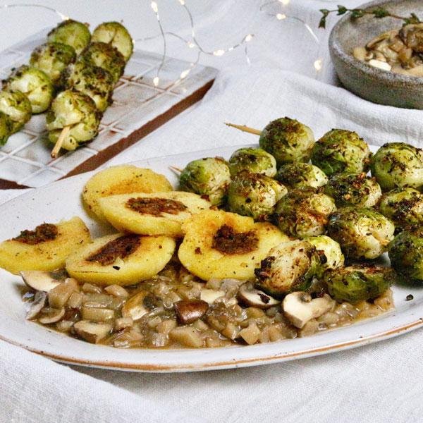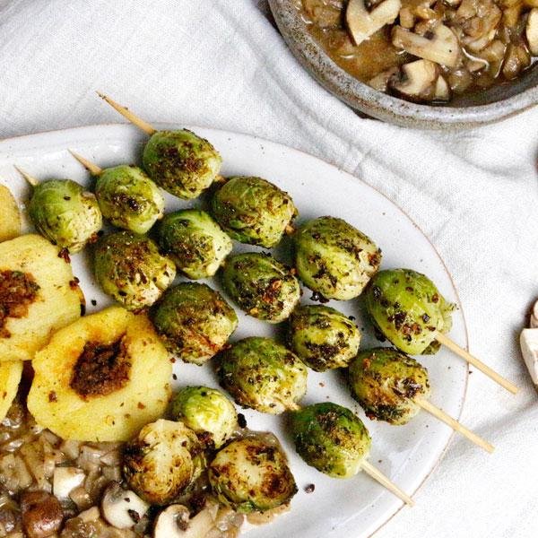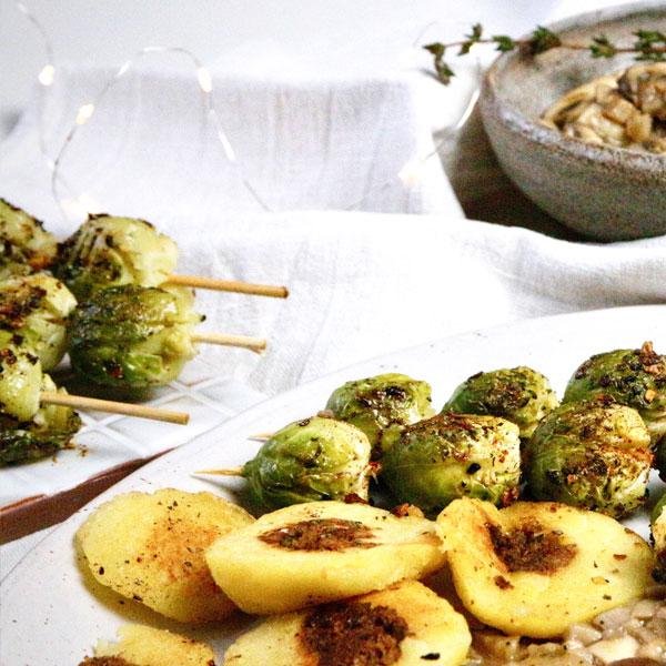Rosenkohl-Spieße mit Pilz-Ragout