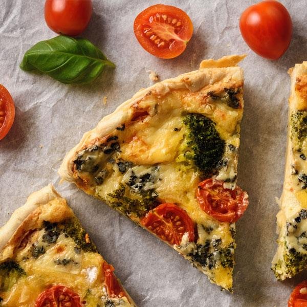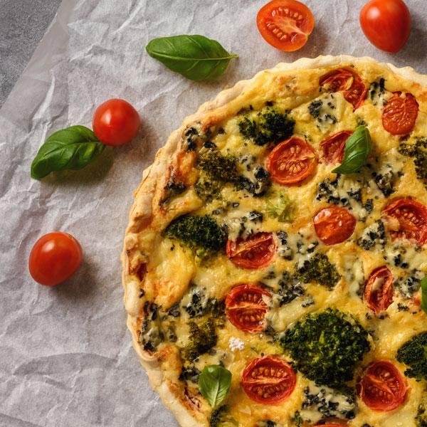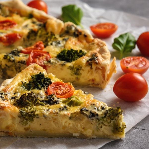 375 g Magerquark, 2 EL Öl, Salz, 4 Eier, 280 g Weizenmehl Type 405, 1 Broccoli, 250 g Cherrytomaten, 1 Prise Zucker, 3 EL Milch, Pfeffer