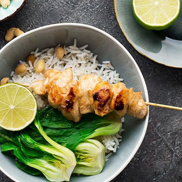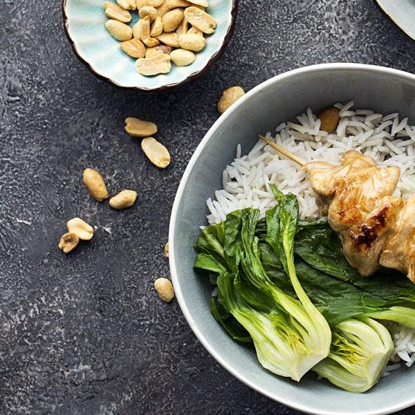 200 g Basmatireis, 400 ml Wasser, 1 Limette, 80 g gesalzene Erdnüsse (Art.-Nr. 25580); für die Spieße: 100 g Happea Flakes (Art.-Nr. 50079), 300 ml Gemüsebrühe, 2 EL Sesamöl, 4 EL Sojasauce Shoyu, 3 TL Reissirup (Art.-Nr. 678346), 1 Msp. Chilipulver, Pfeffer, Salz, 2 Pak Choy, etwas Sesam