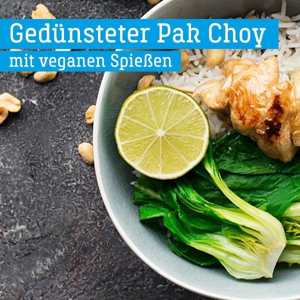 Den Reis im Wasser kochen. In der Zwischenzeit die Spieße zubereiten. Hierfür die Flakes in kochender Brühe einweichen und sobald sie weich sind, gut ausdrücken und in einer Marinade aus Sesamöl, Sojasauce, Reissirup und Gewürzen einlegen. Nun den Pak Choy waschen, halbieren und kurz in einer Pfanne mit einem Schuss Wasser bei geschlossenem Deckel blanchieren. Den Pfannendeckel abnehmen und bei reduzierter Hitze das Wasser verdunsten lassen und leicht salzen. Die marinierten Flakes auf Spieße stechen und in einer Pfanne mit Öl von allen Seiten scharf anbraten. Nun alle Komponenten auf Teller geben und mit Nüssen und etwas Limettensaft garnieren.