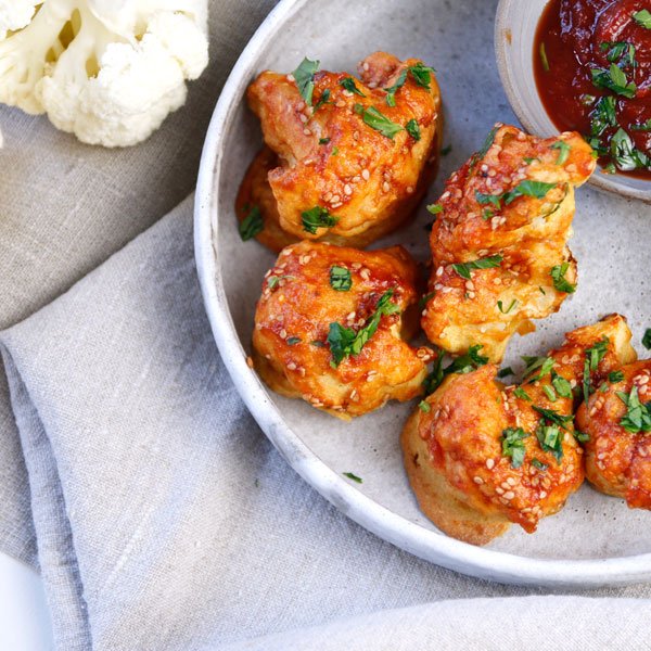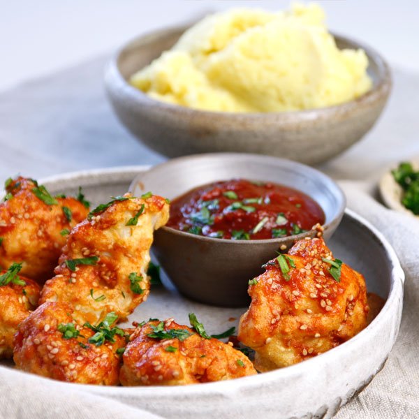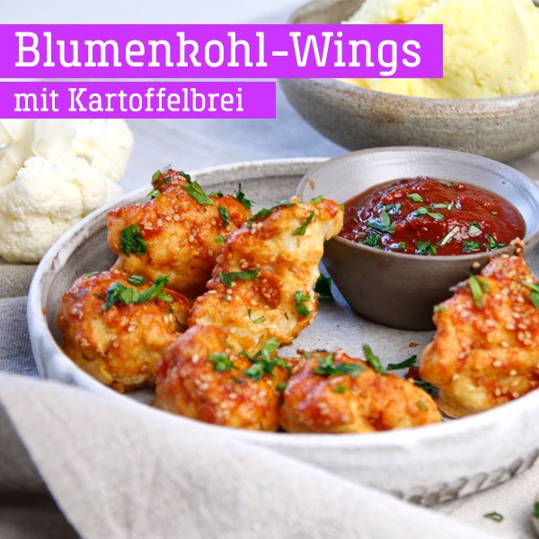 Die Kartoffeln dampfgaren, abkühlen lassen, pellen, pressen oder stampfen und mit Margarine, Sojadrink und Gewürzen verfeinern. Den Blumenkohl in Röschen teilen und waschen. Die Zutaten für den Teig vermengen, die Blumenkohlröschen darin wenden und auf ein Blech mit Backpapier legen. Den Ofen auf 200 °C Ober-/ Unterhitze aufheizen und die Blumenkohl-Wings für 25 Min backen. Barbeque-Sauce mit einem Schuss Wasser und sesam vermengen und die Wings nach dem Backen damit einpinseln. Den Kartoffelbrei mit den Wings auf Teller geben, mit gehackter Petersilie bestreuen, Barbeque-Sauce dazu reichen und servieren.