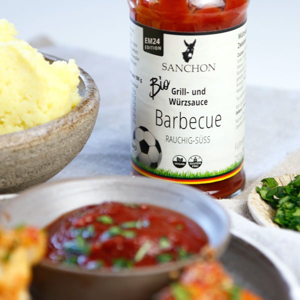 für die Marinade: 60 g Kichererbsenmehl, 100 ml Sojadrink, 1/2 TL Cayennepfeffer, 1/2 TL Ingwergewürz, 1/2 TL Paprika Gewürz, Rauchsalz, 1 EL Sojasauce, 1-2 EL Habanero Hot (Art.-Nr. 38456), 1 Knoblauchzehe oder Knoblauchgranulat, 1 Blumenkohl; außerdem: 400 g Kartoffeln Vfk., 2 EL Alsan Margarine, 1 Schuss Sojadrink, Salz, Muskatnuss, Grillsauce Barbecue (Art.-Nr. 38434), Sesam, 1 Bd Petersilie