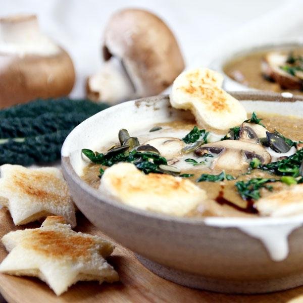 für die Suppe: 2 Pck vakuumierte Maronen (je 200 g) (Art.-Nr. 214526), 150 g Champignons, 3-4 Möhren, 150 ml Hafer Cuisine (oder herkömmliche Sahne), 1 Zwiebel, 100 ml Weißwein, 500 ml Gemüsebrühe, Salz, etw. geriebene Muskatnuss, 1 Prise Paprikagewürz, 2 Zweige Thymian, etw. Habanero Sauce (Art.-Nr. 38456), Olivenöl; für die Einlage: 1 Bd Palmkohl, 1 Handvoll Kürbiskerne, Crema con Aceto Balsamico (Art.-Nr. 530945), 100 g Champignons, Salz, Olivenöl, einige Scheiben Toast (Art.-Nr. 941)