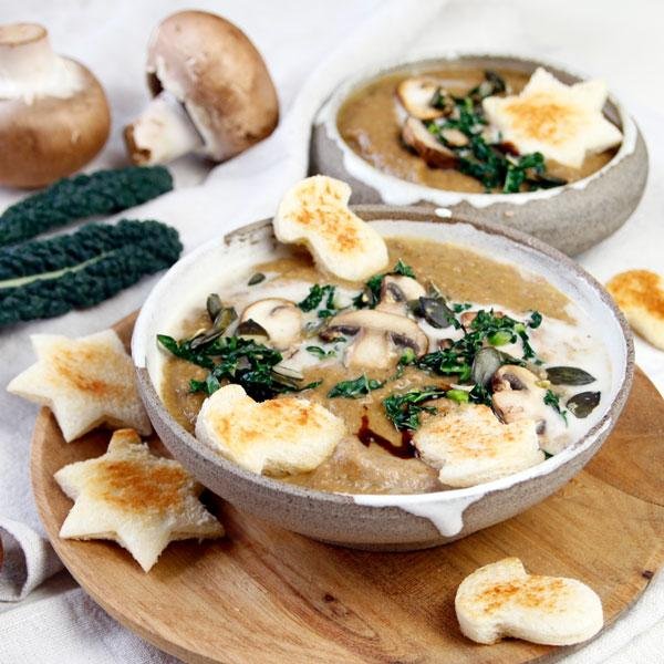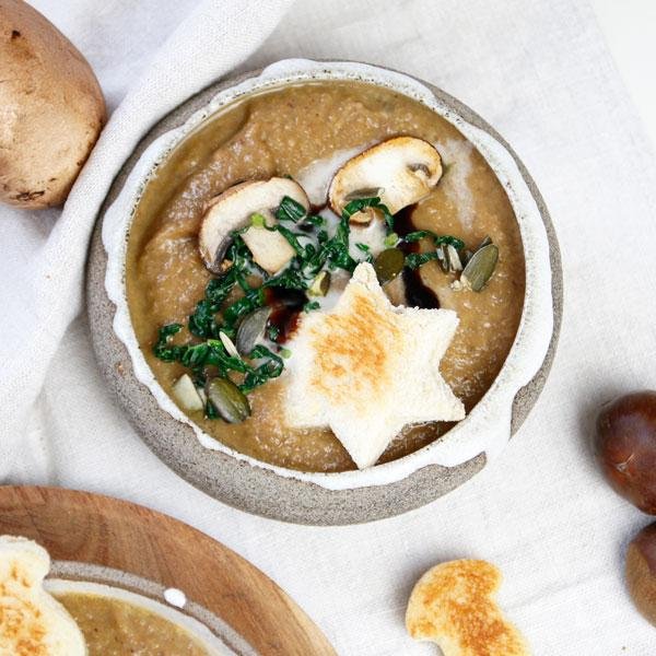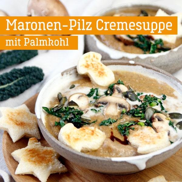 Öl in einem großen Topf erhitzen, um darin die gehackte Zwiebel glasig zu dünsten, dann die in Würfel geschnittenen Möhren zugeben und einige Min braten. Schließlich die vakuumierten und zunächst kleingeschnittenen Maronen beifügen und zuletzt die geputzten, gewürfelten Pilze beifügen. Mit Paprika und den anderen Gewürzen verfeinern und scharf anbraten. Schließlich mit dem Weißwein ablöschen. Mit der Gemüsebrühe aufgießen und alles 15 Min köcheln lassen. Während die Suppe kocht, einige Scheiben Toast mit einem Keksausstecher (z. B. in Stern- oder Pilz-Form) ausstechen. Etwas Fett in einer Pfanne zerlassen und die Toast-Figuren darin von beiden Seiten zu goldbraunen Croutons anrösten. Anschließend herausnehmen, um den gewaschenen und in feine Streifen geschnittenen Palmkohl darin zu schwenken. Pilze putzen und in feine Scheiben schneiden. Dann zum Kohl in die Pfanne geben und ebenfalls kurz mit anbraten. Einige Kürbiskerne grob hacken und beiseitelegen. Nun wieder der Suppe widmen, diese mit einem Pürierstab zu einer feinen Cremesuppe verarbeiten und mit der Hafer Cuisine verfeinern. Hierbei einen kleinen Schuss für das Anrichten der Suppe zurückbehalten. Die Suppe in Schälchen geben, mit einem Schuss Sahne (Alternative), Kürbiskernen, einem Schwenk Balsamico, der Gemüseeinlage und den Croutons anrichten.