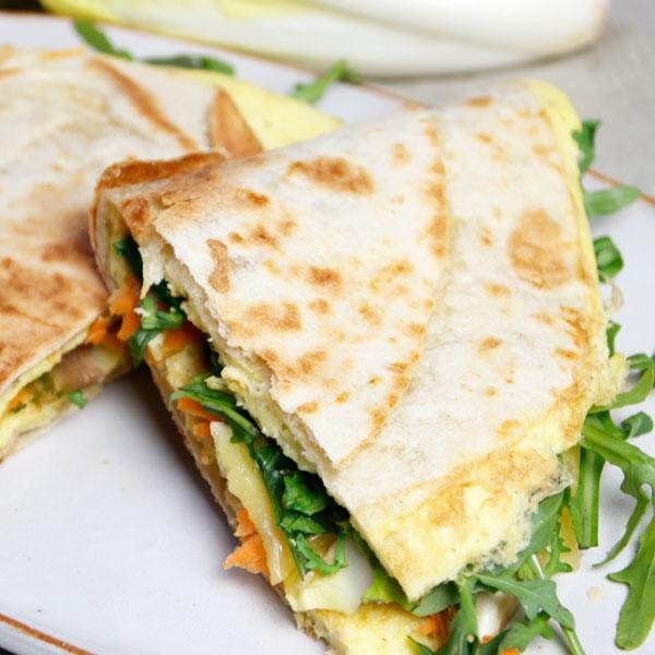 Eier mit Gewürzen verquirlen und würzen. Salate waschen. Chicorée in dünne Streifen schneiden. Möhren waschen und reiben. Cheddar in Scheiben schneiden und Linsen in einem Sieb ausspülen. Öl in einer Pfanne erhitzen und einen Teil der Ei-Masse hineingeben. Ei leicht stocken lassen und zwei Wraps etwas versetzt darauflegen. Wenn die Ei-Masse fest ist alles wenden und mit Linsen, Möhre, Salaten und Käse belegen. Dann die Wraps auf der Hälfte zuklappen, auf einen Teller geben, halbieren und mit frisch gehackter Petersilie garnieren.