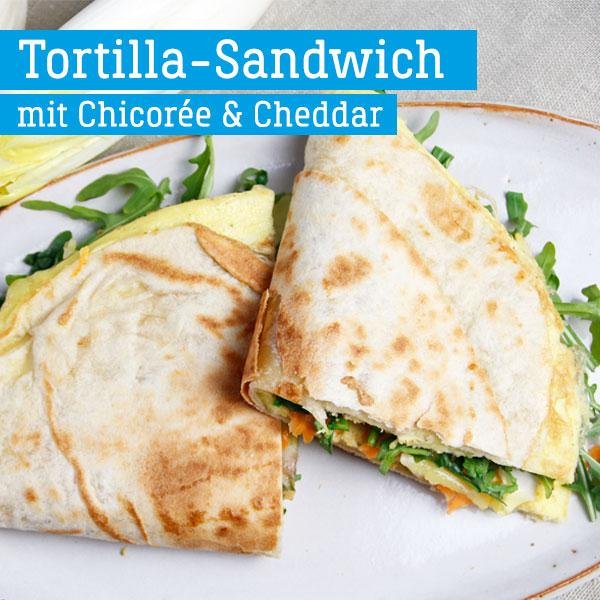 2 Tortilla Wraps Packungen (Art.-Nr. 736500), 4 Chicorée, 300 g Möhren, 1 Dose Beluga Linsen (Art.-Nr. 702750), 200 g Cheddar, 150 g Rucola, 6 Eier, Salz, Pfeffer, Paprika Pulver n. B., Öl für die Pfanne, Petersilie