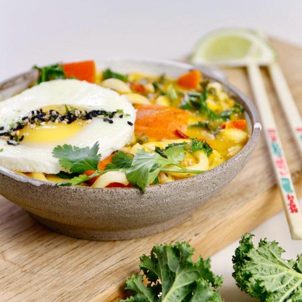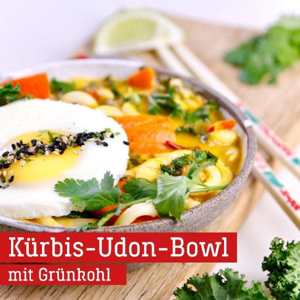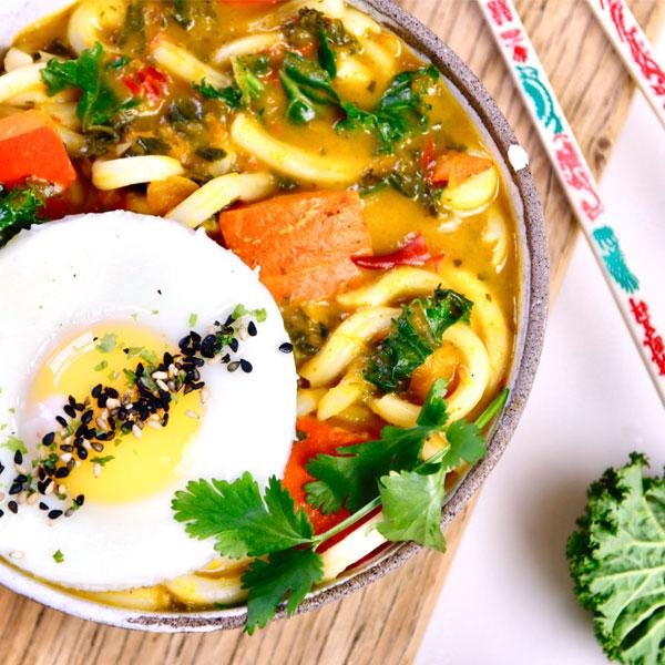 Kürbis und Grünkohl waschen. Vom Grünkohl den Strunk entfernen und die Blätter kleinzupfen. Den Kürbis entkernen und würfeln. Möhren in dünne Scheiben schneiden. Kokosöl in einer tiefen Pfanne erhitzen. Gewürze und nach Belieben Chili hineingeben und den Kohl darin andünsten. Dann Möhren und Kürbis zugeben und nach kurzem braten mit der Brühe ablöschen. Misopaste einrühren und mit Kokosmilch aufgießen. Bei geschlossenem Deckel köcheln lassen bis der Kürbis gar ist. Einen Teil der Masse abnehmen und pürieren, dann zurück in die Pfanne geben. Udon Nudeln hinzugeben und ziehen lassen. In der Zwischenzeit Spiegeleier anbraten und mit Furikake-Gewürz bestreuen. Mit Limette abschmecken und mit frischem Koriander garniert servieren.
