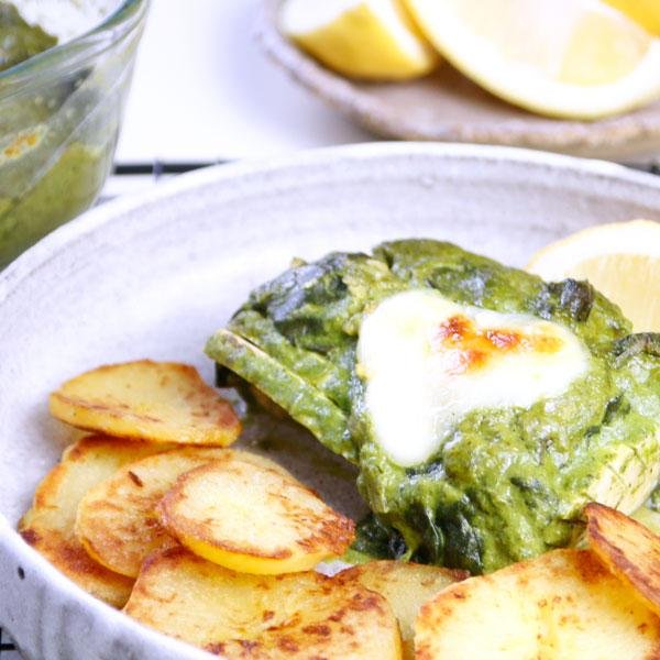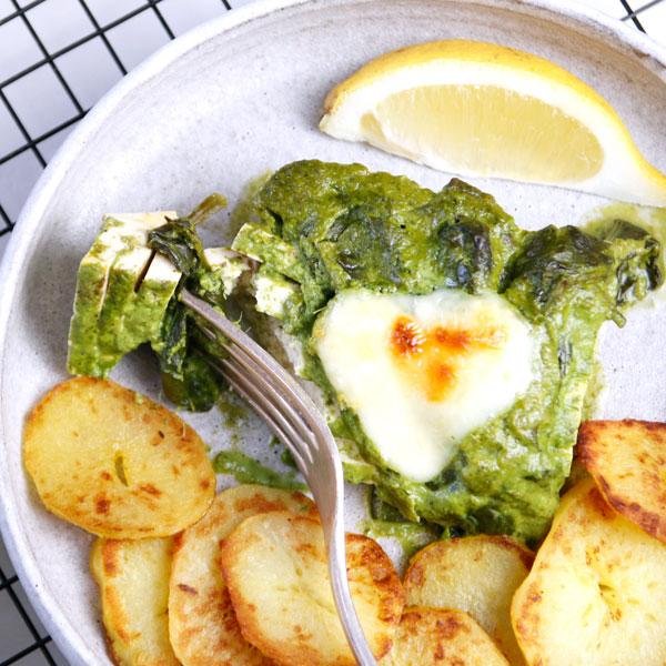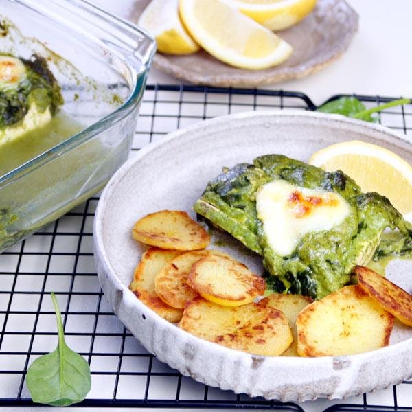 Den Tofu aus der Packung holen, abtropfen lassen und horizontal teilen, sodass man zwei flache Stücke vom Tofu erhält. Die flachen Tofu-Stücke zwischen zwei Essstäbchen legen und bis zu den Stäbchen mit einem scharfen Messer in 0,5 cm Abständen einritzen. In Salzwasser 3-4 Min köcheln, dann herausnehmen, abtropfen lassen und in eine gefettete Auflaufform geben. Noriblatt mit 50 ml Wasser in einem Mixer zerkleinern, oder 3 EL No-Fish-Sauce verwenden. Damit den Tofu marinieren. Inzwischen das Spinat-Topping zubereiten. Hierfür Spinat gründlich waschen. Die Hälfte mit dem Joghurt, Sahne, Grana Padano, Muskatnuss, Salz und Knoblauch in einen Mixer geben. Den übrigen Spinat in einer Pfanne mit etwas Öl erhitzen. Den Spinat aus dem Mixer hinzugeben und erhitzen bis der Spinat zusammengefallen ist. Die Spinat-Masse auf den Tofu geben und die Mozzarella-Herzen oder einen herkömmlichen Mozzarella über dem Schlemmerfilet verteilen. Dann bei 180 °C Ober-/ Unterhitze 20 Min backen. Filet mit Zitronensaft beträufeln und nach Belieben Reis oder (Brat-) Kartoffeln dazu reichen.