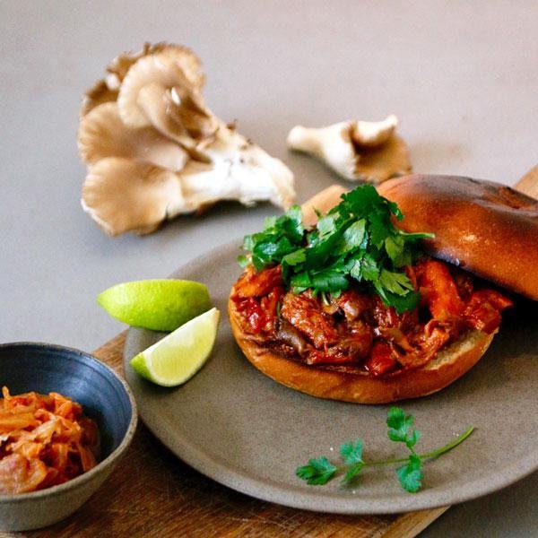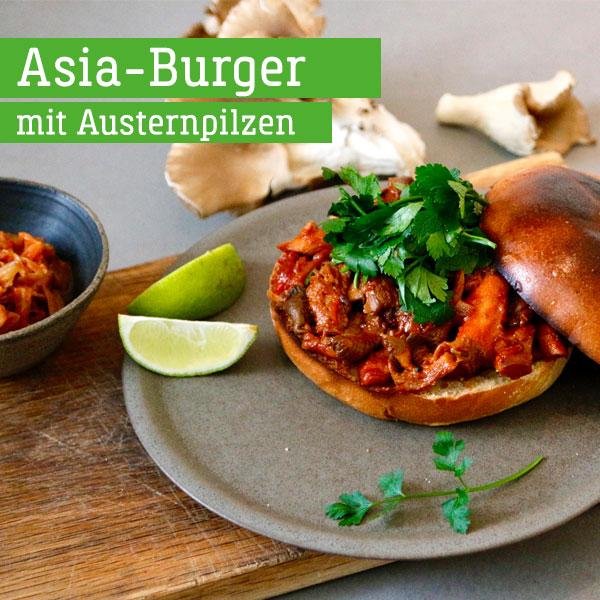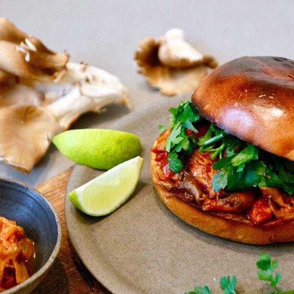400 g Austernpilze, 50 ml Teriyaki Wok Sauce (Art.-Nr. 450782), 2 EL Soja-Sauce, 3 TL Tomatenmark, 100 ml Wasser, Pfeffer, 1 Peperoni, 1 TL Smokey Paprika (Art.-Nr. 394147), 1 Zwiebel, 1 Bund Petersilie, 2 Brioche Burger Buns (Art.-Nr. 21956), 1 Glas Kimchi original oder mild (Art.-Nr.: 152520, 152522), 1 Limette