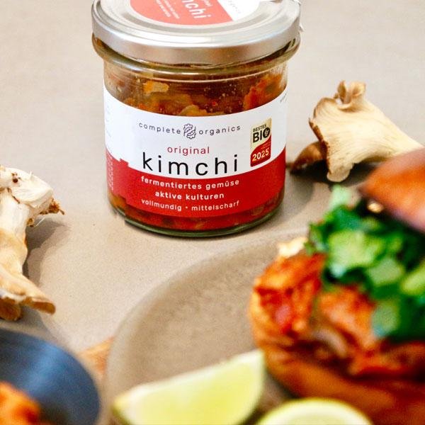 Die Pilze putzen, grob kleinschneiden und beiseitelegen. Die Zwiebel schälen, fein würfeln und in Öl in einer großen Pfanne zusammen mit beliebig viel Peperoni dünsten. Paprikagewürz und Tomatenmark zugeben. Dann die Saucen und Tomatenmark einrühren und nach und nach Wasser zugeben. Die Pilze in die Pfanne geben und gut unterrühren. So lange garen, bis sie gut zusammengefallen und weich sind. Mit Limettensaft und Pfeffer verfeinern. Die Burger Buns toasten oder grillen und mit den Pilzen belegen. Kimchi ebenfalls auf den Burger oder als Beilage in ein Schälchen geben. Burger mit reichlich frisch gehackter Petersilie belegen und mit der zweiten Hälfte zudecken.