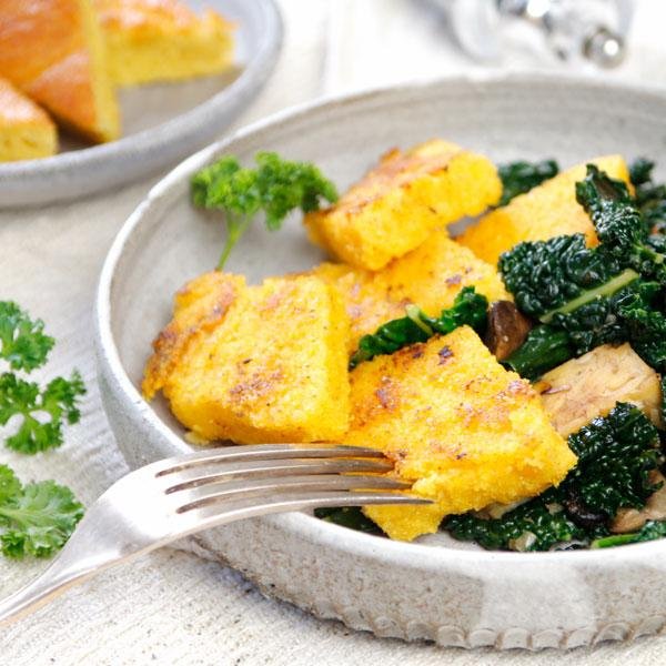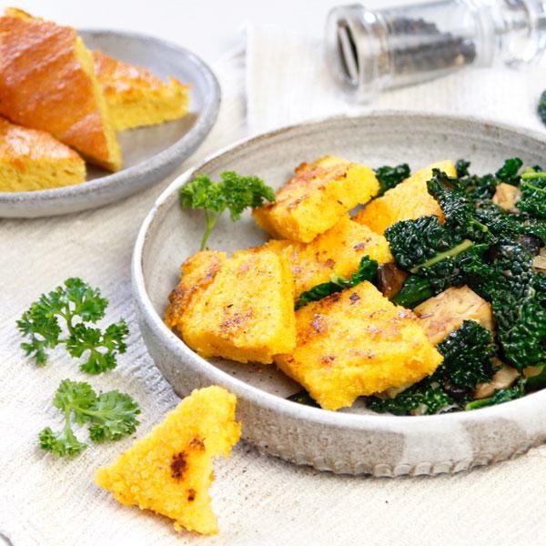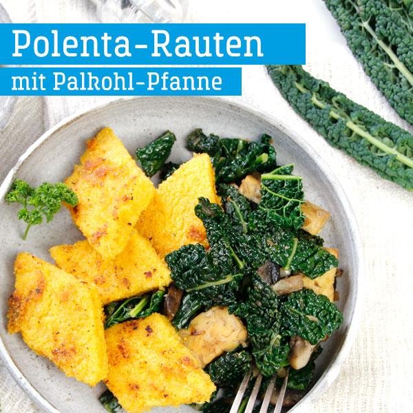 für die Rauten: 100 g Polenta, 250 ml Sojadrink, Salz, 1 Prise Muskat, 1-2 EL Alsan Margarine; für die Kohl-Pfanne: 1 Zwiebel, 1 EL Alsan Margarine, 1 Bund Palmkohl, 1 Pack. Tempeh (Art.-Nr. 660200), 150 g Champignons, 1 TL Paprika Gewürz, 60 ml Sojadrink, Salz, Pfeffer