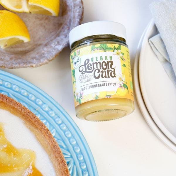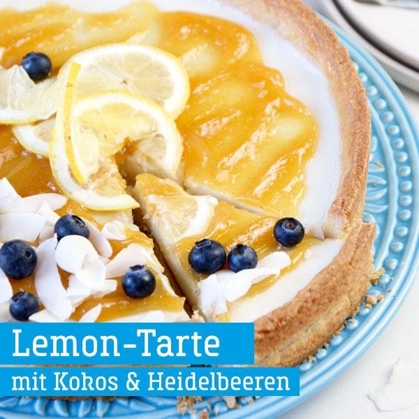 für den Boden: 300 g Mehl, 100 g Kokosblütenzucker, 1 Prise Salz, 200 g Margarine, 2 EL Wasser; für den Belag: 1 Kokosmilch (400 ml), 1 Glas Lemon Curd, vegan (Art.-Nr. 106010), 1 Zitrone, 2 TL Agar Agar, 1 Schale Heidelbeeren (125 g), Kokoschips (Art.-Nr. 506012)