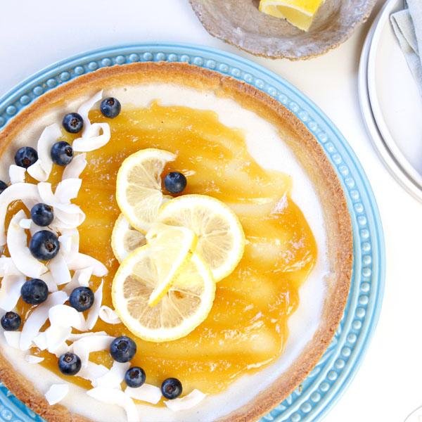 Zutaten für den Teig verkneten und im Kühlschrank in Frischhaltefolie 30 Min ruhen lassen. Dann herausnehmen und ausrollen. In eine gefettete Springform geben und gut andrücken. Die Ränder 2 -3 cm hochziehen und ebenfalls gut andrücken. Mit einer Gabel einstechen und im heißen Ofen bei 200 °C 20 Min blindbacken. Anschließend kurz abkühlen lassen. In der Zwischenzeit die Kokosmilch mit 1 EL Lemon Curd und Abrieb einer Zitrone und Agar Agar aufkochen lassen. 2-3 Min köcheln lassen. Den Boden mit 1 EL Lemon Curd bestreichen und die Kokos-Creme darauf geben. Im Kühlschrank aushärten lassen. Restliches Lemon Curd in einem Topf bei niedriger Hitze erwärmen und auf dem ausgehärteten Kuchen verstreichen. Mit frischen Blaubeeren und Kokoschips garnieren und noch mal 1 Std kaltstellen, dann genießen.