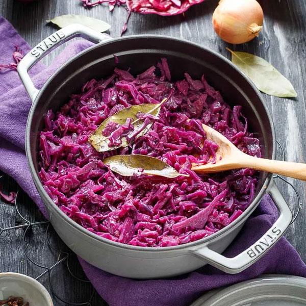 Zubereitung: Zwiebel in Öl anschwitzen, Rotkohl fein hobeln, Apfel würfeln, alles zugeben. Mit Essig, Gewürzen und etwas Wasser ca. 30–40 Min sanft garen, abschmecken.