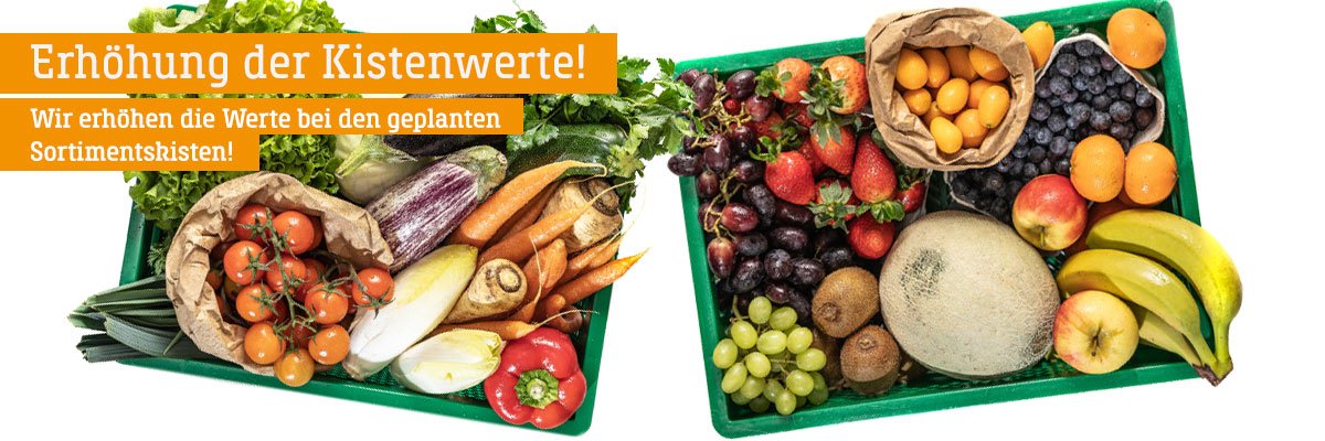 Zum Beispiel verändert sich unsere mittlere Gemüsekiste vom Warenwert 17,50 € auf runde 20,- €. Eine kleine Bürokiste verändert sich von 12,50 € auf 15,- €.