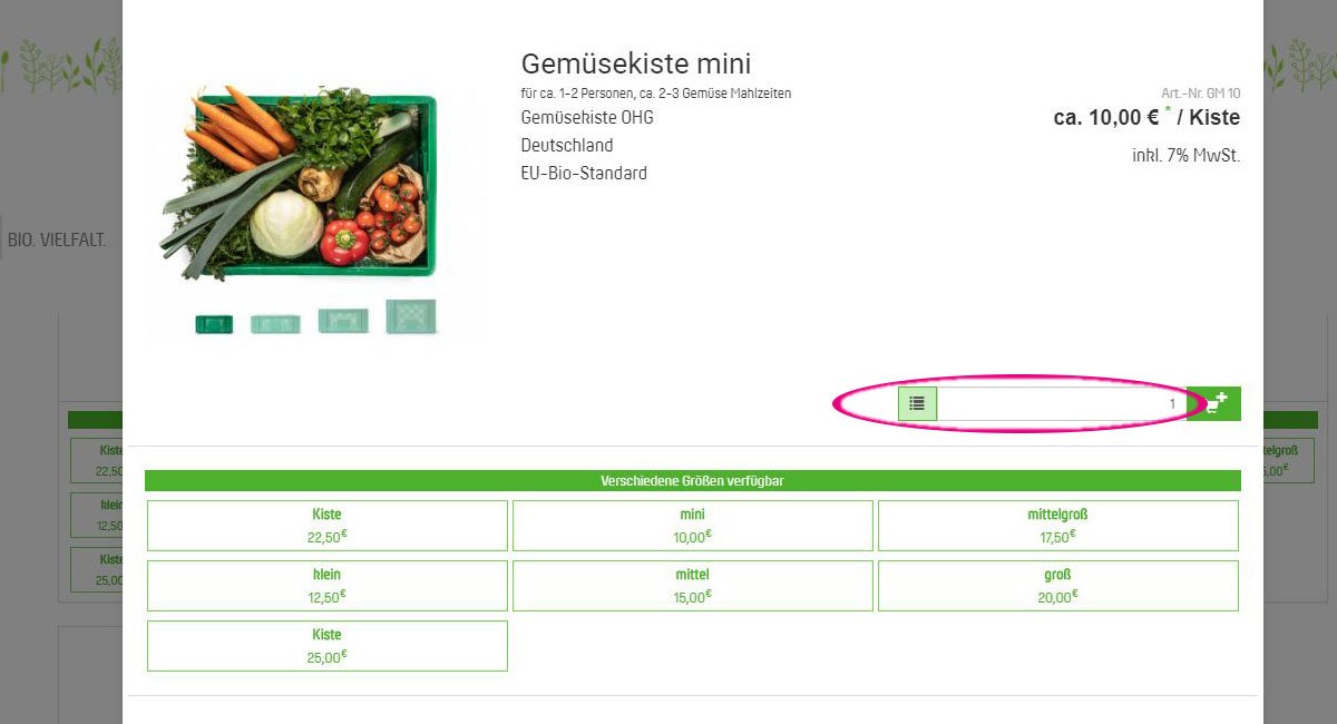 Wenn Sie zum Beispiel unsere Gemüsekiste mini für 10,- € nur zu einem bestimmten Termin bestellen möchten, klicken Sie einfach auf den kleinen Warenkorb rechts am Artikel. Wenn Sie die Gemüsekiste allerdings noch in ihrem Inhalt verändern möchten, klicken Sie bitte auf den im Bild markierten Knopf links vom Mengenfeld. Damit legen Sie alle einzelnen Artikel (Möhren, Porree, Salat etc.) der Gemüsekiste in den Warenkorb und können dann die Einzelpositionen im Warenkorb bearbeiten bzw. entfernen.