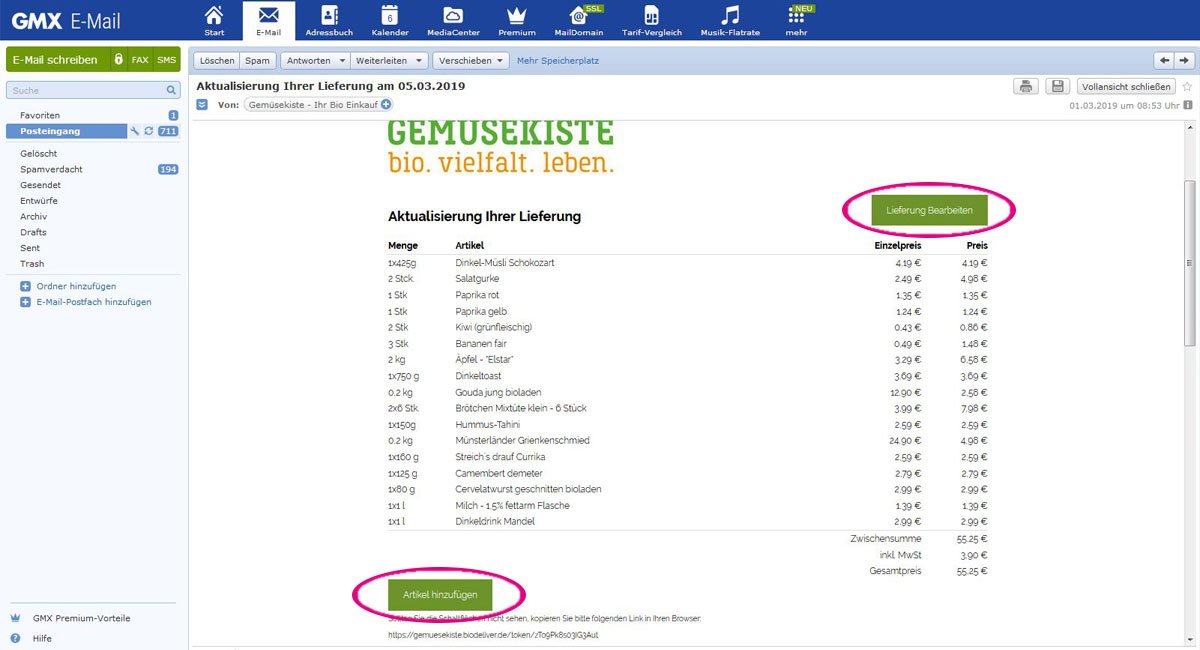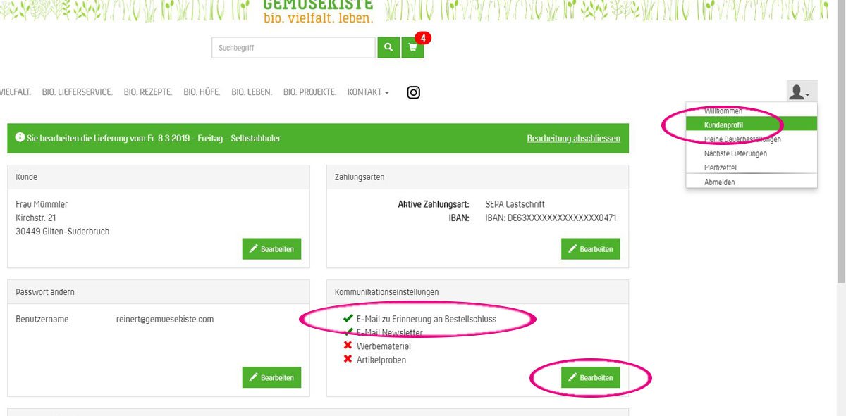 Sie bekommen auf Wunsch gerne eine Erinnerung per E-Mail an den Bestellschluss Ihrer nächsten Lieferung, damit Sie diesen nicht verpassen. Senden Sie uns dazu einfach eine kurze E-Mail oder stellen Sie den Erinnerungsservice selber in Ihrem Kundenprofil ein. Hier können Sie auch angeben, ob Sie den Newsletter und auch Werbematerial sowie Artikelproben bekommen möchten.