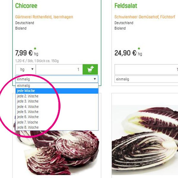Haben Sie die Gemüsekisten im Abo eingerichtet (unter "Meine Dauerbestellungen") sehen Sie die Einzelpositionen immer automatisch in Ihrem Warenkorb ab Donnerstagnachmittag für Liefertermine in der Folgewoche.