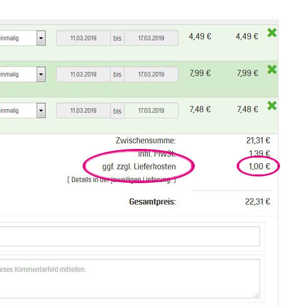 Diese Funktion hilft Ihnen wesentlich, Ihren Wocheneinkauf schneller zu erledigen. Sollten Sie das Produkt in einer bestimmten Woche mal nicht benötigen, können Sie es natürlich im Warenkorb immer auch löschen.