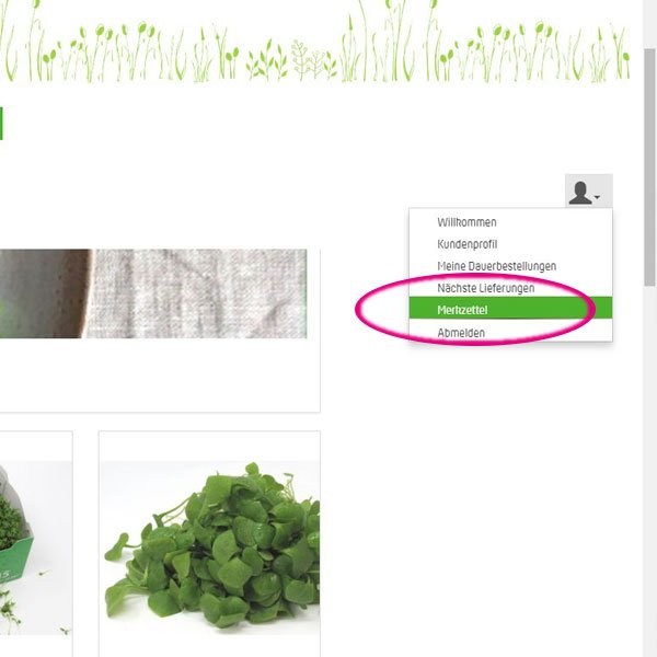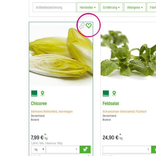Achtung, diese Funktion ist nur im eingeloggten Bereich verfügbar! Sie sehen bei jedem Produkt oben rechts in der Ecke ein blasses graues Herz. Einfach anklicken und es wird grün (Bild 1). Damit haben Sie das Produkt in Ihre Merkliste gelegt. Die Merkliste können Sie über Ihr Kundenkonto oben links aufrufen (Bild 2). Jetzt können Sie daraus einkaufen oder auch Produkte wieder löschen.