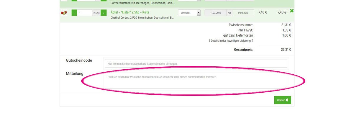Bevor Sie Ihren Warenkorb mit dem Button „jetzt kaufen“ an uns absenden, können Sie uns unten im Feld „Mitteilungen“ eine Nachricht zum Warenkorb senden. Hier nennen Sie uns bitte auch Obst- und Gemüsesorten, die Sie nicht mehr in der Kiste bekommen möchten. Natürlich dient dieses Feld auch für andere Mitteilungen jeder Art an uns.