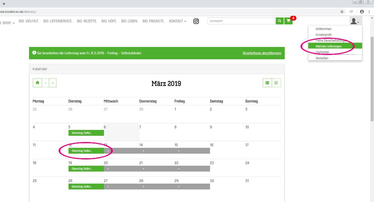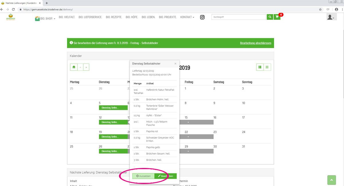 Natürlich können Sie jederzeit eine Lieferung aussetzen. Dies können Sie sehr schnell im Kundenprofil oben links unter „nächste Lieferungen“ einstellen. Klicken Sie in der Liste oder im Kalender (je nach gewählter Ansicht) auf den Termin, den Sie aussetzen möchten.
