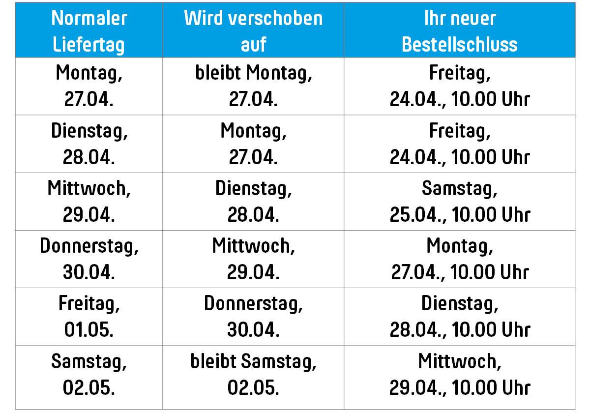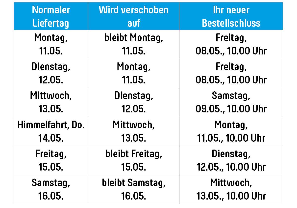 Zum 1. Mai und Himmelfahrt verschieben sich die Liefertage!