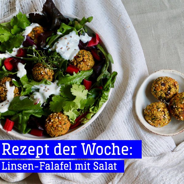 Den Ofen auf 220 °C vorheizen. In der Zwischenzeit Salat und Tomaten waschen, trocknen und in mundgerechte Größe schneiden. Das Dressing anrühren, dafür den Koriander hacken und unter das Dressing rühren. Den Salat in einer Schüssel mit dem Dressing anmachen. Die Linsen-Masse zu Bällchen Formen (ca. 8 Stück) und im Ofen für 25 Min backen. Die Falafel zu dem Salat geben, mit Sesam bestreuen und servieren.