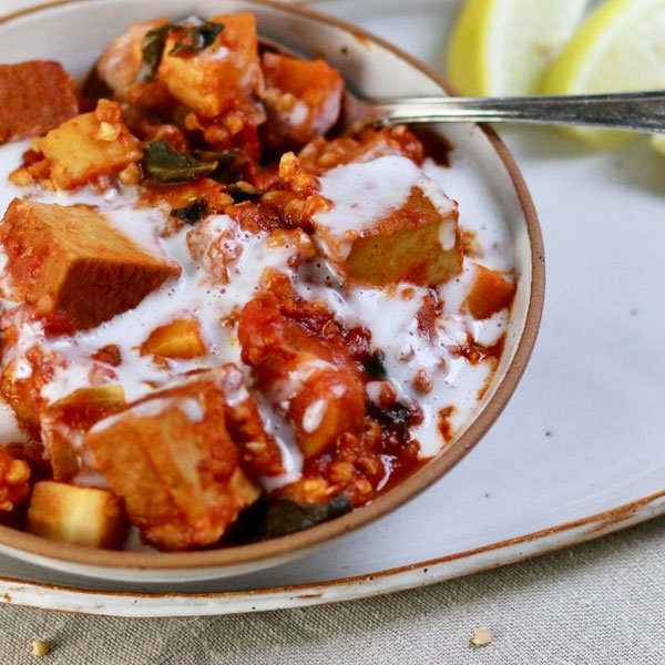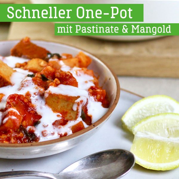 4 Pastinaken, 1 Bund Mangold (ca. 400 g), 1 Zwiebel, 1 daumengroßes Stück Ingwer, 2 Räuchertofu (a 200g), 150 g Buchweizen, 1 L Gemüsebrühe, 1 Dose stückige Tomaten (200 g), 1 Glas Tomatensoße Arrabiata (Art.-Nr. 103900) (280 g), 1 Zitrone, Olivenöl, Salz, Pfeffer, 1 Prise Chili, 200 ml Kokossahne, 2 TL Ahornsirup
