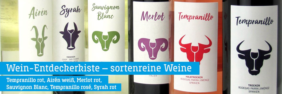 Unsere Entdeckerkiste trumpft gleich mit sechs sortenreinen Weinen: Rotwein Tempranillo, Airén weiß, Merlot rot, Sauvignon Blanc, Tempranillo rosé und Syrah rot.