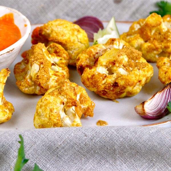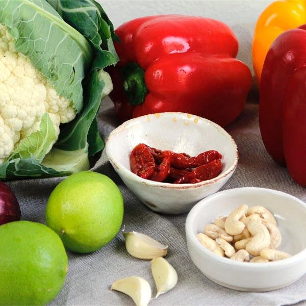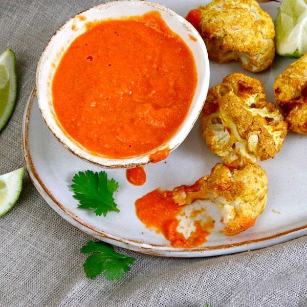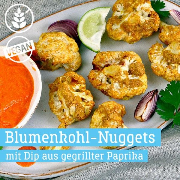 für den Dip: 3 Paprika, 100 g Cashewkerne, 1 rote Zwiebel, 3 Knoblauchzehen, 1 Bund Koriander, 5 getrocknete Tomaten in Öl, 2 EL Öl von den eingelegten Tomaten, Salz, Pfeffer, 2 Limetten; für die Nuggets: 1 Blumenkohl, 100 g Reismehl (od. Weizenmehl), ca. 1/2 Tasse Kichererbsenmehl, 1 TL Salz, 1 EL Hefeflocken, 1 TL geräuchertes Paprikapulver, 1/2 TL Cayennepfeffer, 1/2 TL Kreuzkümmel (Cumin), 185 ml (pflanzl.) Milch, 2 EL Tapiokastärke