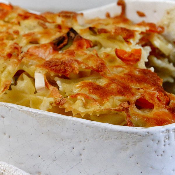 1/2 Steckrübe, 1 Porree, 400 g Farfalle (Schleifennudeln), 200 ml Sojasahne, 2 Möhren, 150 g Alpenstokz Käse (Art.-Nr. 331051), 1 Apfel, 50 ml Sojadrink, etwas Muskatnuss, Pfeffer, Salz, 1 EL Gemüsebrühe, 1 TL Honig o. Agavendicksaft