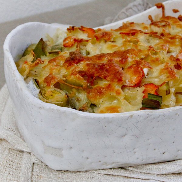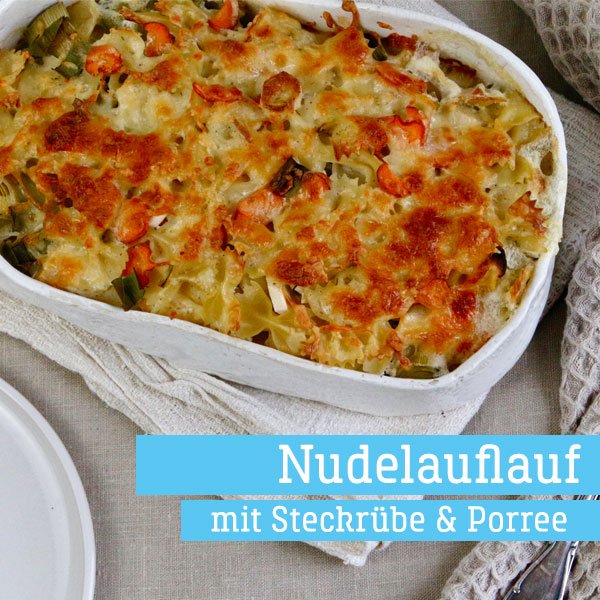 Die Nudeln in Salzwasser kochen, die Steckrübe schälen und in dünne Scheiben schneiden. Den Porree der Länge nach einschneiden und kopfüber unter fließendem Wasser abspülen. Die Möhren waschen und in dünne Scheiben schneiden. Den Apfel entkernen und in Würfel schneiden. Die Nudeln abgießen. Sahne mit Milch, Brühepulver, Gewürzen und Honig verquirlen. In eine Auflaufform etwas Olivenöl geben, um darin die Nudeln mit dem Gemüse abwechselt zu schichten. Mit einer Schicht Nudeln enden, die Flüssigkeit über dem Auflauf verteilen und den Käse darüber reiben.