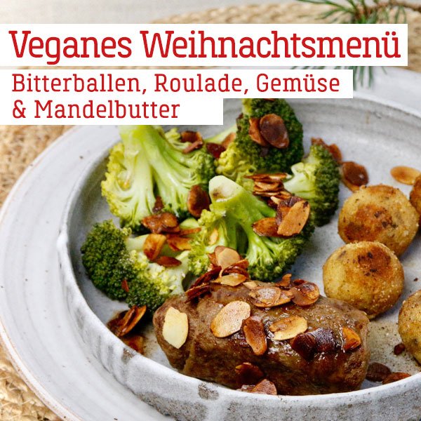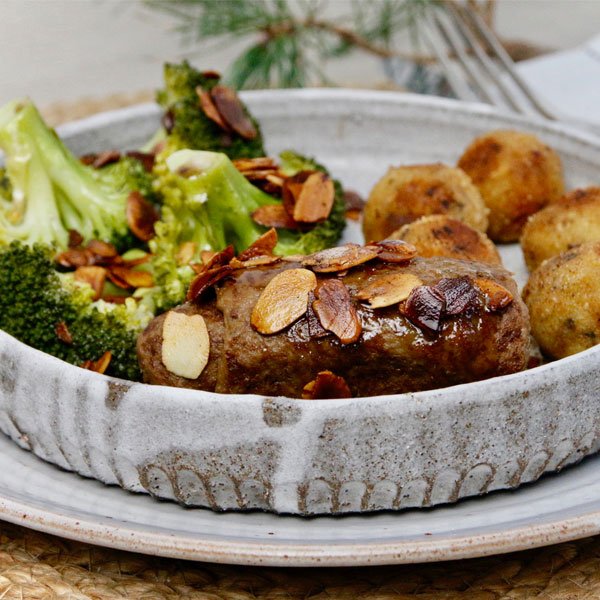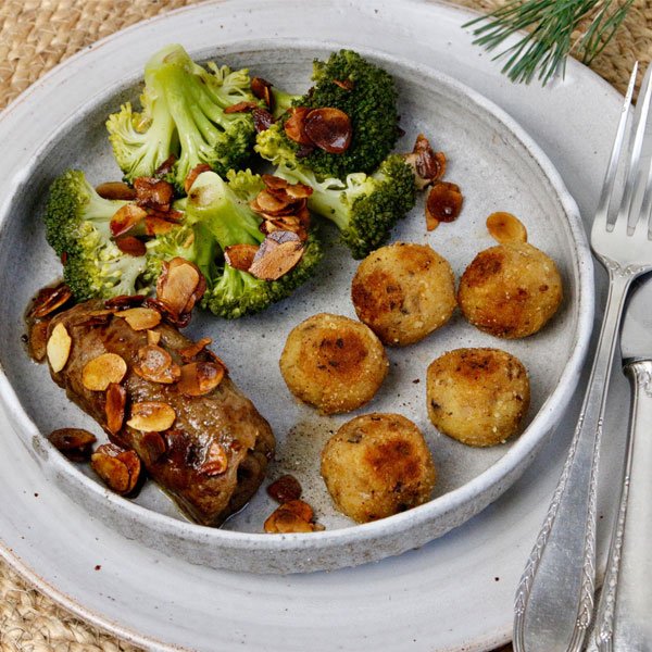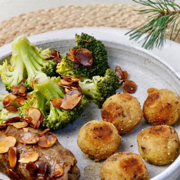2 Rosmarin-Rouladen (Art.-Nr. 17387), 65g Alsan Margarine (Art.-Nr. 521300), 3 EL Mandelblättchen (Art.-Nr. 506056), 1 Prise Salz, 1 Broccoli; für die Bitterballen: 400 g Nicola Kartoffeln, 2 EL Kartoffelmehl, 140 g Steinchampignons, 1/2 Zwiebel, 1/2 TL Smokey Salt, 1 TL Smokey Paprika (Art.-Nr. 394146), 1 Prise Muskatnuss, 1 Prise Pfeffer, 1 Schuss Mandelmilch, 1 EL Olivenöl, 1 EL Alsan Margarine, Paniermehl