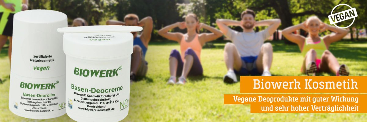 Ohne aufwändige Verpackung und viel Drumherum- sondern einfach schlicht und gut, oder viel mehr schlicht und noch viel besser. Der Biowerk® Kosmetikforschung ist es gelungen, zwei vegane Deoprodukte auf den Markt zu bringen, die einfach durch ihre Wirkung und die sehr hohe Verträglichkeit überzeugen – selbst beim Auftragen nach der Rasur – kein Brennen und keine Hautirritation, dazu eine dezente Kokos-Duftnote. Besonders geeignet für Sportler und dunkle Sport Shirts oder schwarze Mode – denn durch fehlende Zinkoxide hinterlässt es keine weißen Flecken auf der Haut oder Kleidung. Die aluminiumfreie, vegane Basen-Deocreme bietet einen natürlichen Schutz bei Transpiration bei gleichzeitiger Hautpflege. Es enthält keine synthetischen Duft,- und Farbstoffe, allergene Duftstoffkomponenten oder Konservierungsmittel.