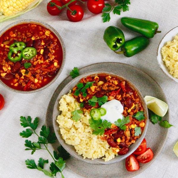 Die Hirse in der doppelten Menge Salzwasser kochen. Das Chili mit Hirse servieren. Dazu frisch gehackten Koriander, Petersilie und eine Limettenspalte reichen.