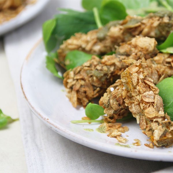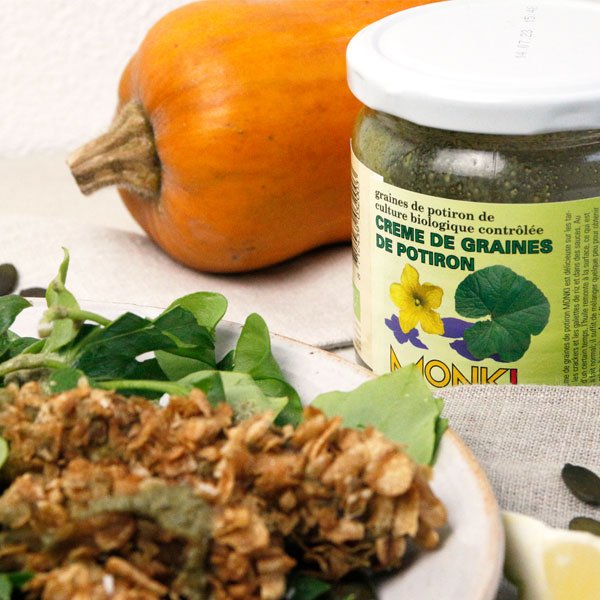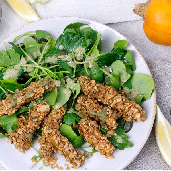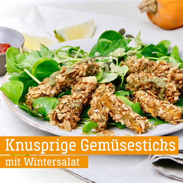 für die Gemüsesticks: 1 kleiner Butternut-Kürbis, 1/2 Sellerie mit Grün, 5 EL Kürbiskernmus mit Salz (Art.-Nr. 34518), 1/2 Zitrone, 3 EL Wasser, 1 Packung Cornflakes Dinkel (Art.-Nr. 29726); für den Salat: ca. 150 g Postelein, 1/2 Zitrone, 3 EL Kürbiskernmus, Salz, Pfeffer, 1 Prise Chili, 1 Knoblauchzehe, 1 TL Agavendicksaft, 20 ml Wasser, das Grün vom Sellerie, Kürbiskerne zum Garnieren
