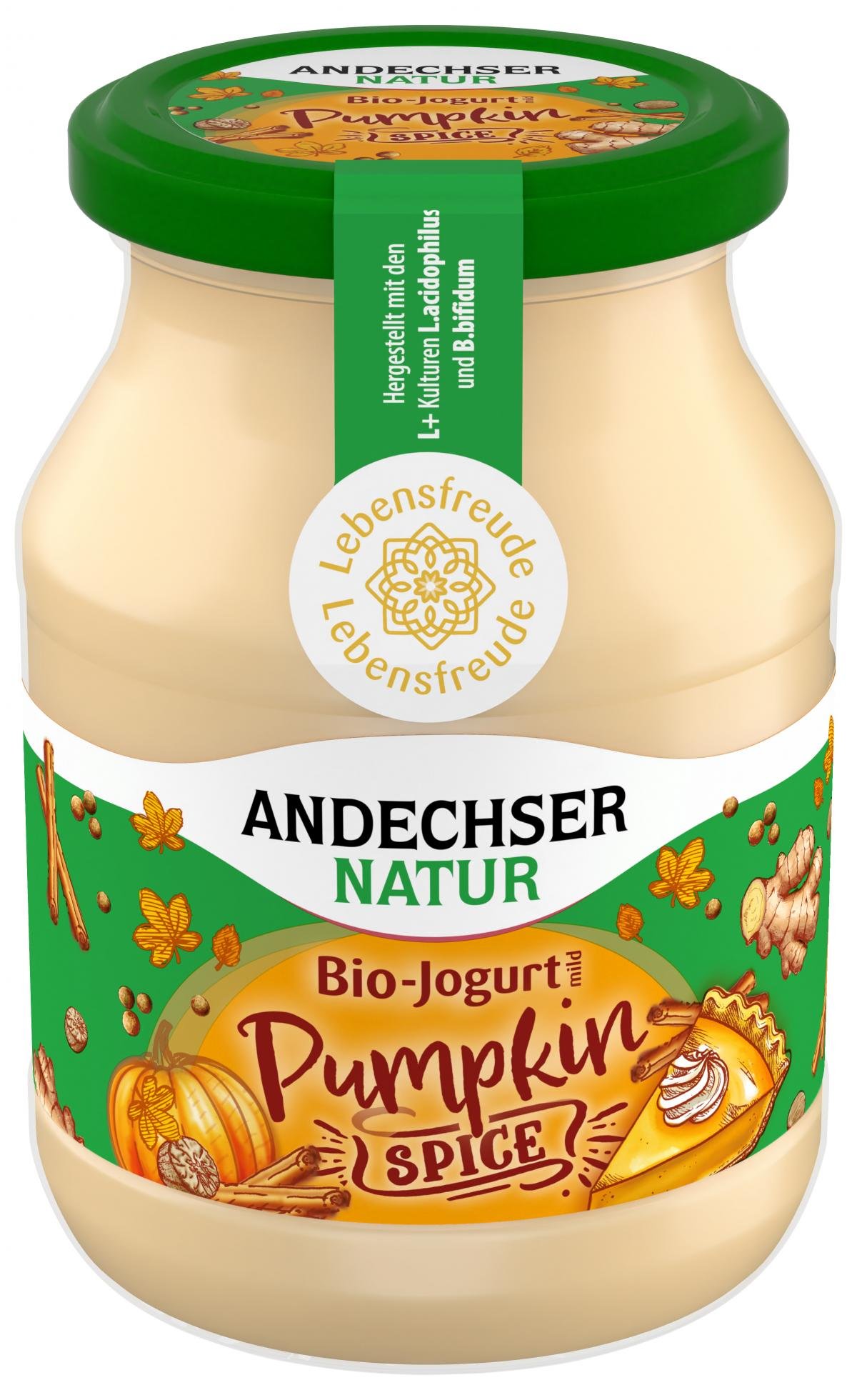 JOGURT MILD*, 20% Kürbisgewürzzubereitung* [Rübenzucker*, Wasser, Gewürzmischung* (Zimt*, Ingwer*, Muskatnuss*, Piment*), Zitronensaftkonzentrat*, färbendes Karottensaftkonzentrat*, native Maisstärke*, Verdickungsmittel: Johannisbrotkernmehl*].