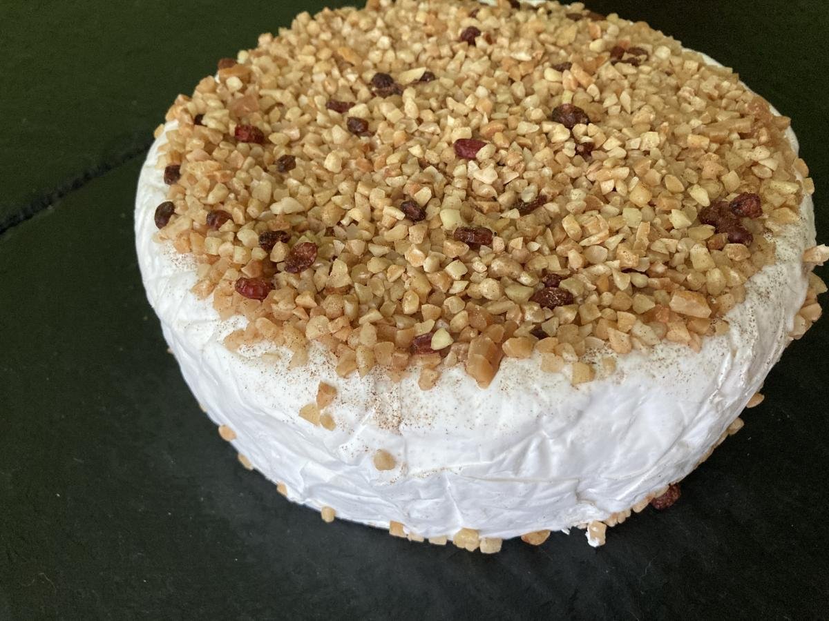 als junger Käse mild-cremig mit feinem Butteraroma und einem samtigen Weißschimmel überzogen. Das Topping besteht aus einer wunderbar duftenden Mischung aus gerösteten Mandeln und weihnachtlichen Gewürzen, als Eye-catcher kommen noch kleine rote Berbetritzen dazu.