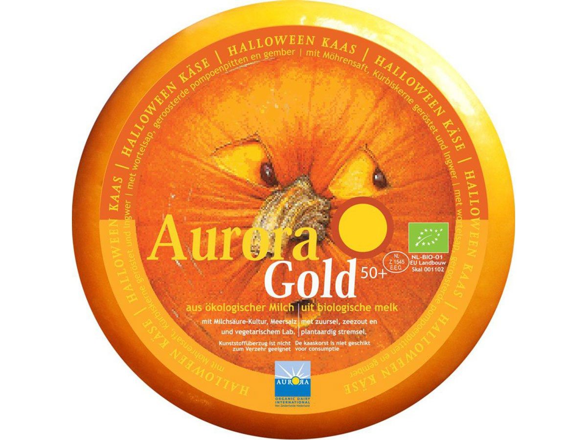 Aurora Gold Halloweenkäse, Im Oktober erhältlich - der Kürbis orange Halloween Käse mit Demeter Möhrensaft, gerösteten Kürbiskernen und Ingwer. Als Brotbelag oder Snack, zum Reiben und Überbacken geeignet